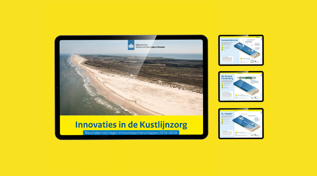 Het eindresultaat is een interactief, digitaal portfolio waarin de negen innovaties centraal staan, ondersteund door 3D-infographics en persoonlijke verhalen van zowel de collega’s van Rijkswaterstaat als van de marktpartijen. Naast het portfolio werden posters, banners en uitnodigingen ontwikkeld voor een landelijke beurs en andere bijeenkomsten.